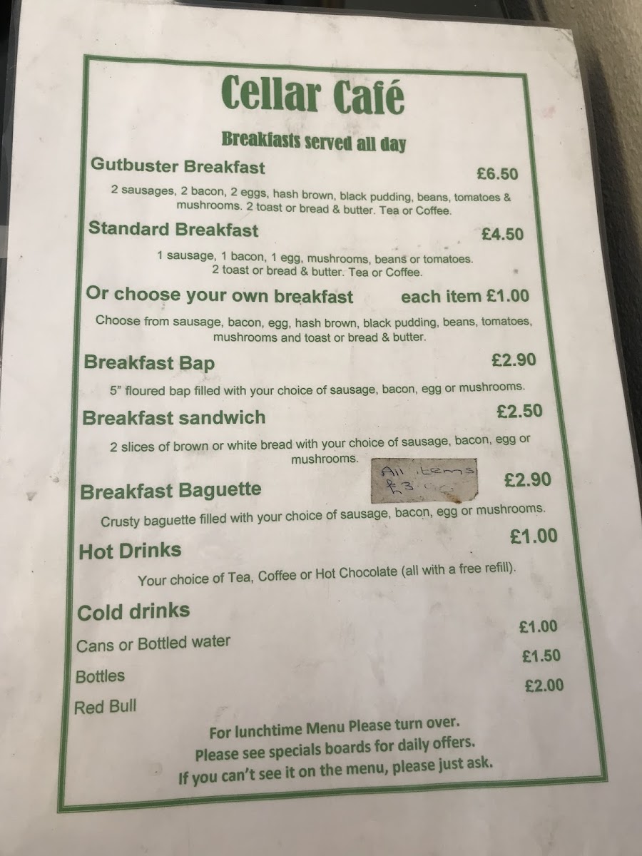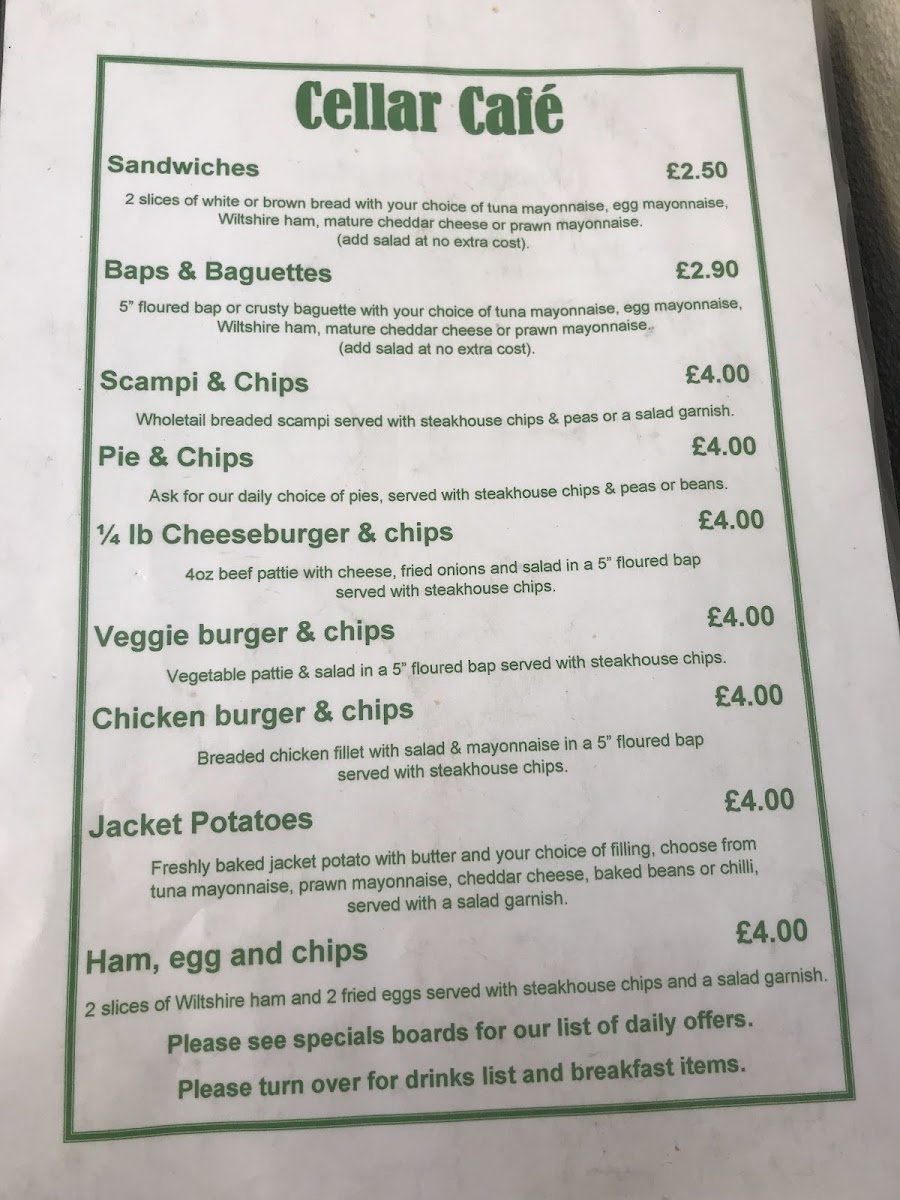 This menu is well-suited for visitors looking for traditional cafe fare during breakfast hours or for light, informal meals, offering a straightforward selection without extensive variety beyond these core categories.